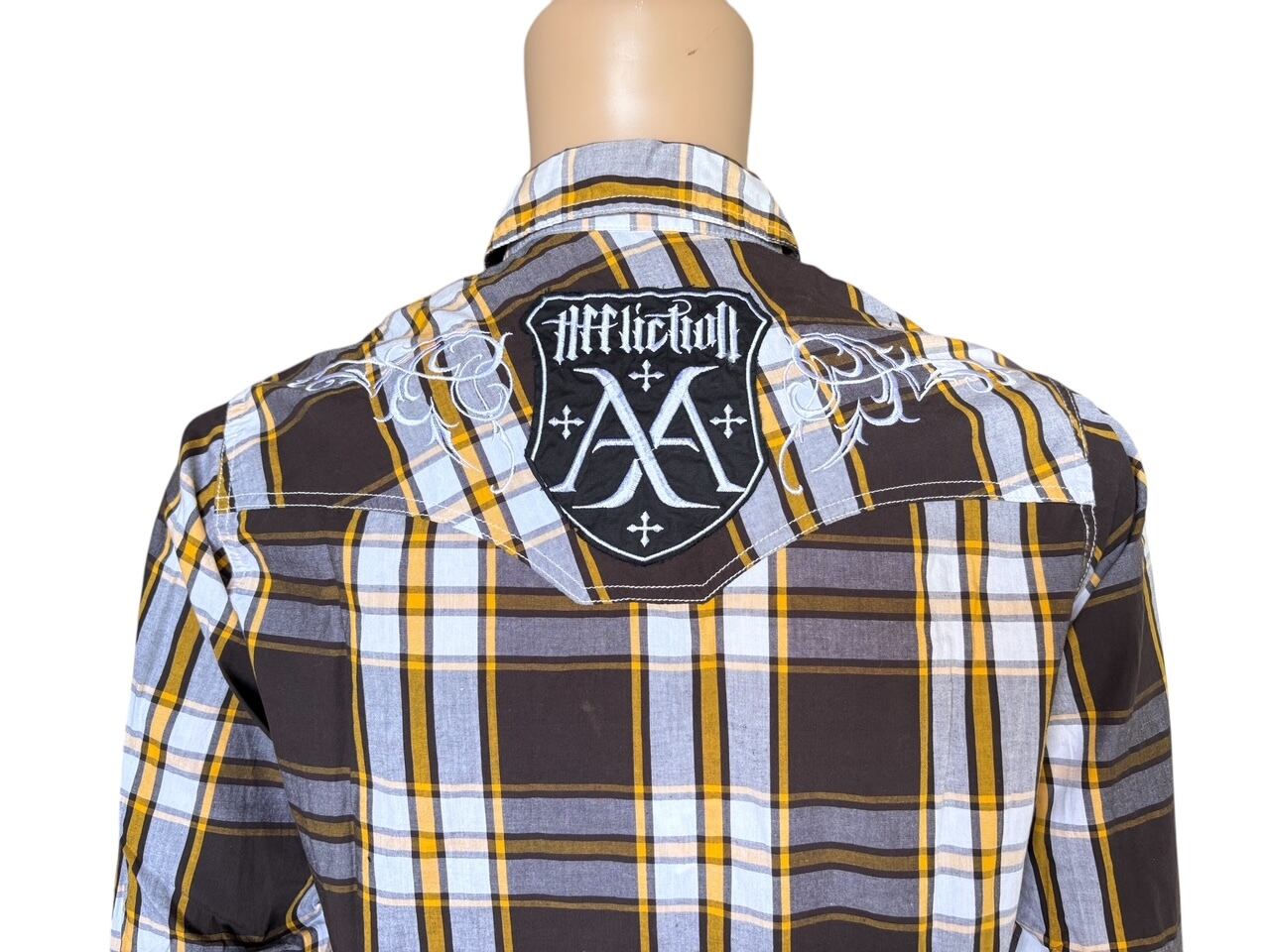 ・バックの上部にAfflictionの大きなワッペン、つたの絡まるデザイン、白の刺繍がさわやか!