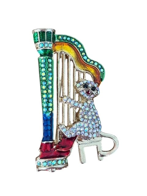 ・ラインストーンを多く使ったハーブを弾く猫のブローチです。
