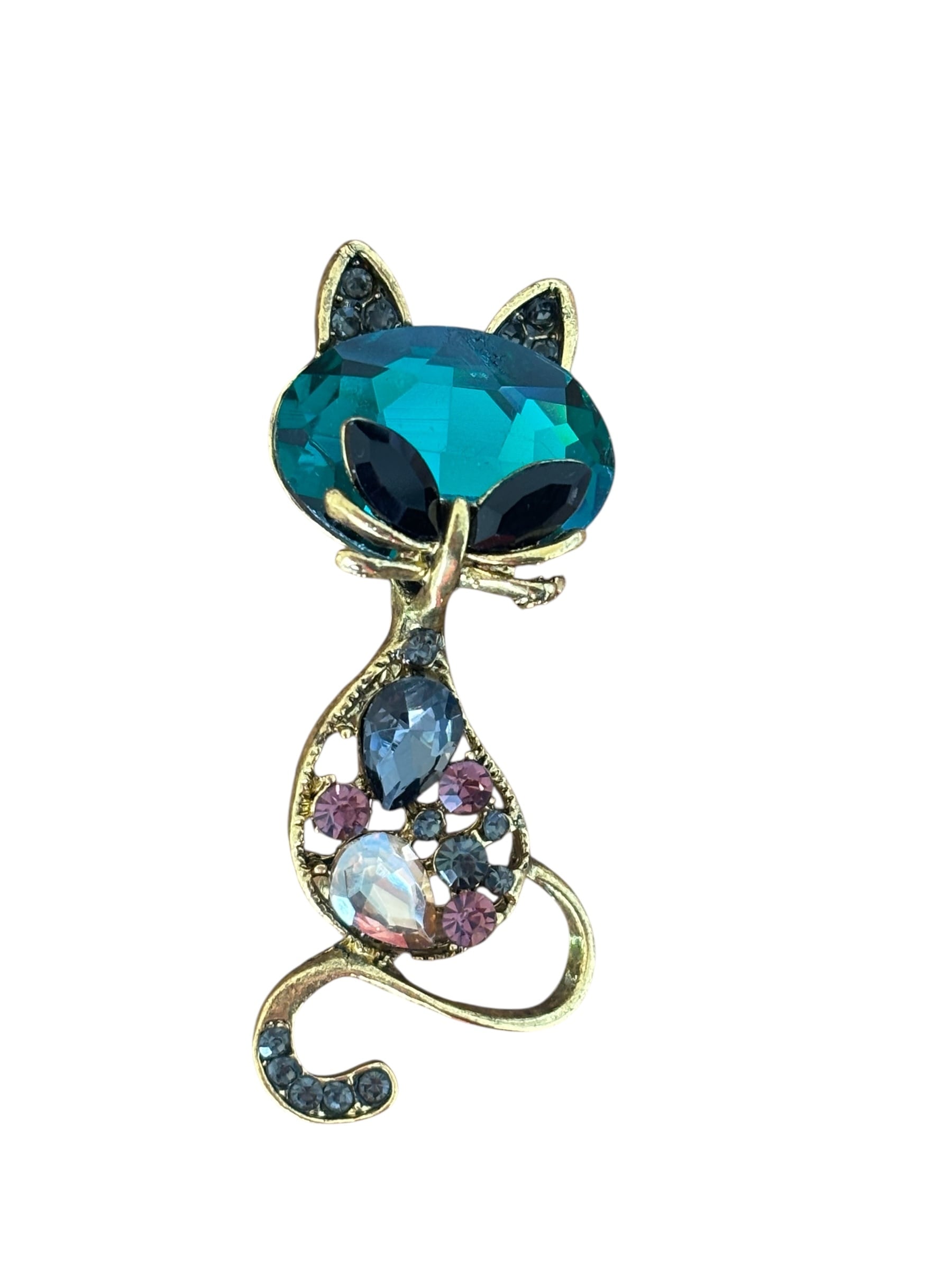 ・エメラルドグリーンの大きな顔の猫のブローチです。