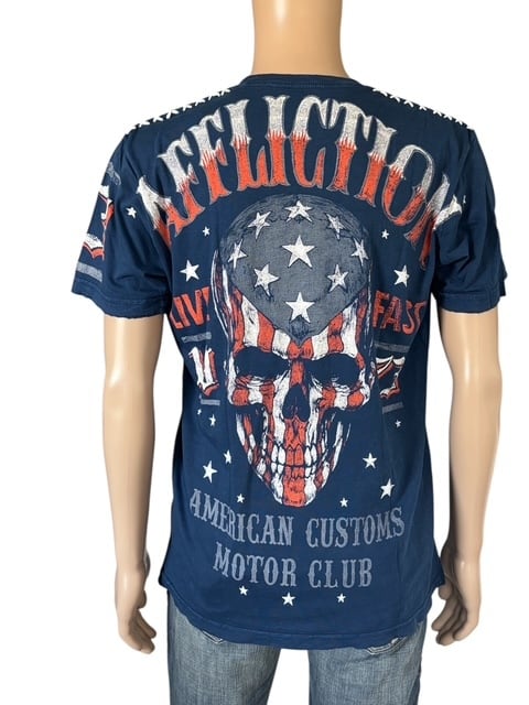 ・バックのデザインは、とてもインパクトがあります。大きな星条旗モチーフデザインのスカルが中央に位置し、頭には「Affliction」の大きな文字、サイドは「LIVE FAST」「1973」の文字で挟まれ、下部分に「American Customs MOTOR CLUB」文字がプリントされています。