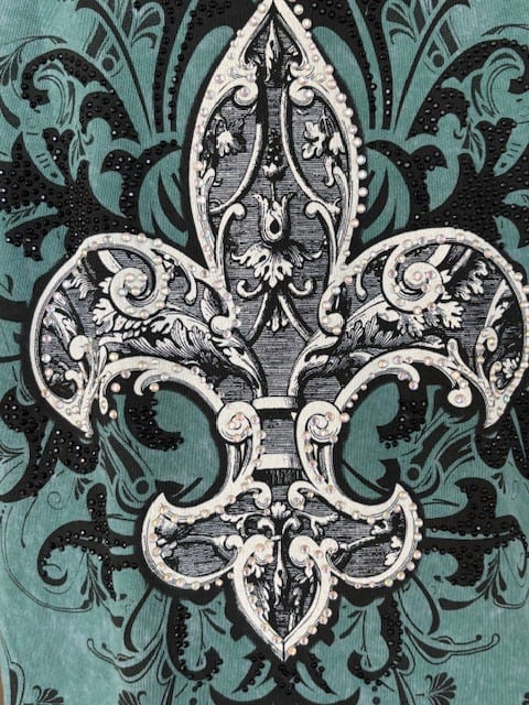 ・フロントの百合の紋章の周りにはデッサン風にツタが描かれています。百合の紋章の上には琥珀色のラインストーンとその周りのツタには黒のスパンコールが散りばめられています。