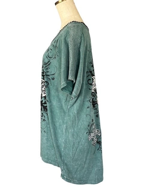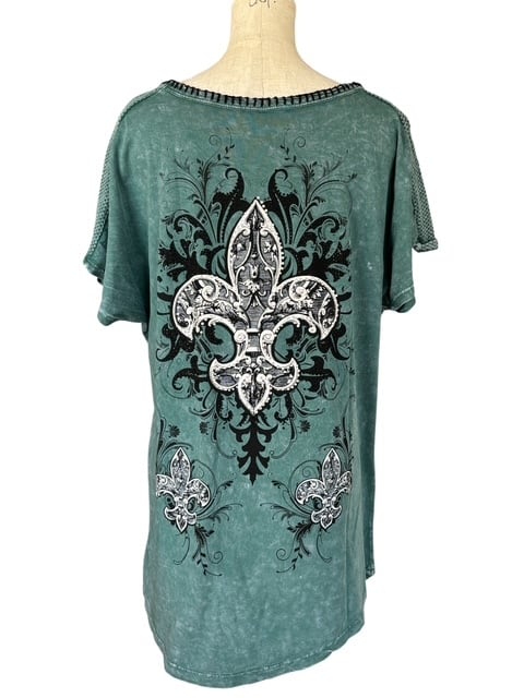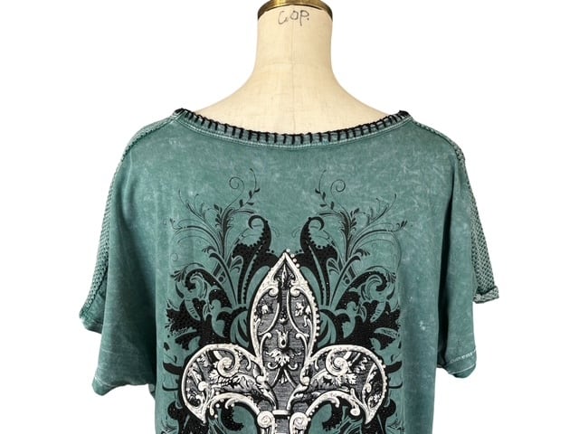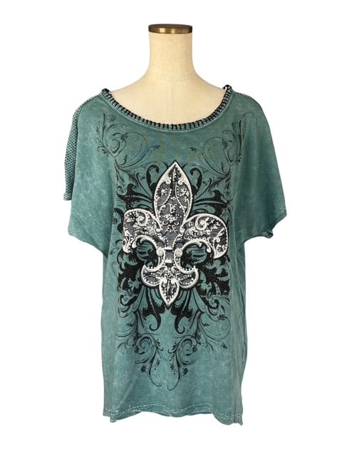 ・濃いめのブルーのタイダイプリントに、大きな百合の紋章のデザインが印象的なチュニック。