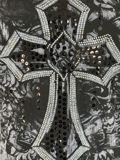 ・クロスの周りにはデッサン風にツタが描かれています。クロス上には琥珀色のラインストーンと黒のスパンコールが散りばめられています。