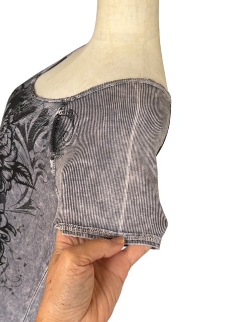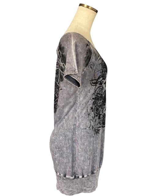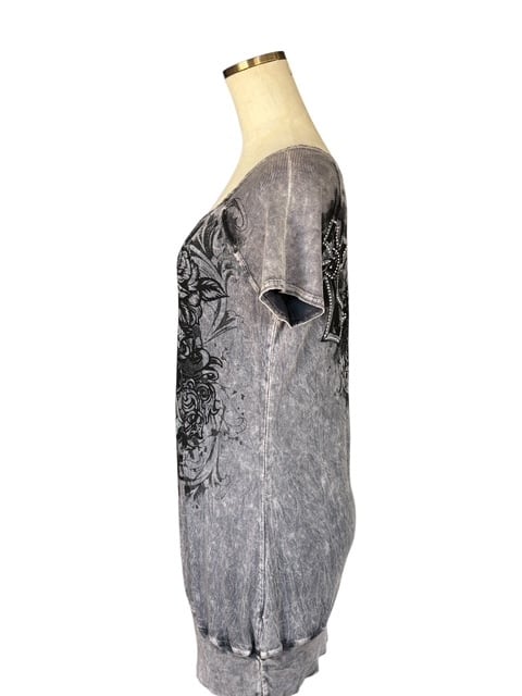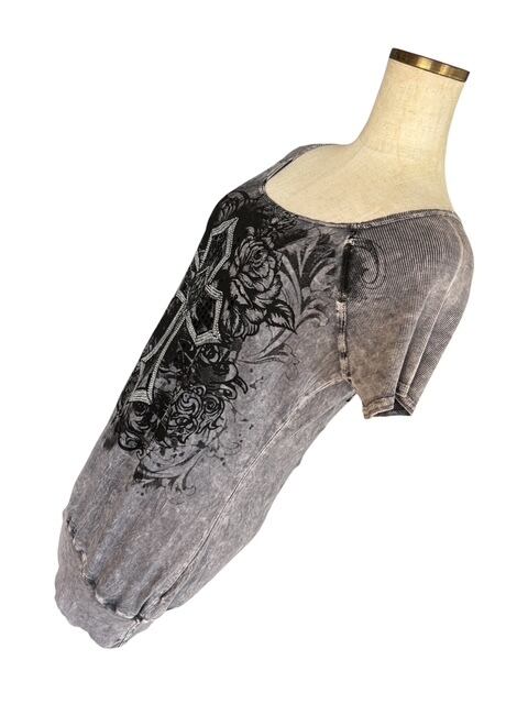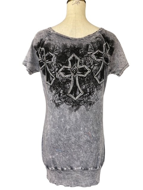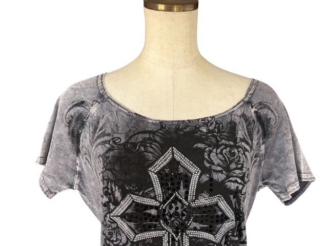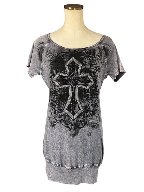 ・グレーのタイダイプリントに、大きなクロスのデザインが印象的なチュニック。