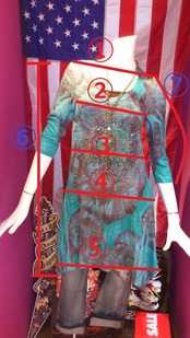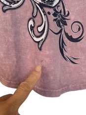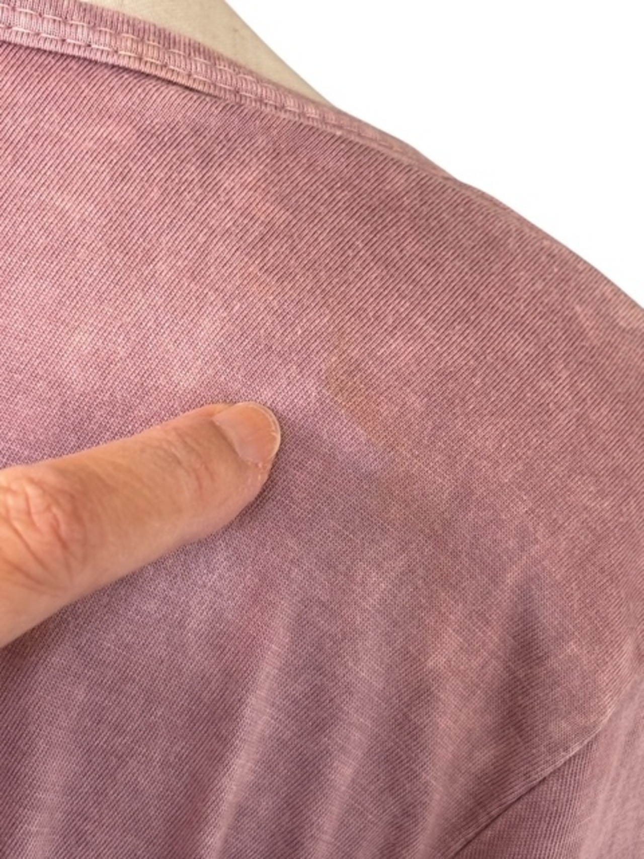 ・写真Photo 8~9枚めをご覧ください。インクシミ(ハイター液を1滴2敵垂らしたような)があります。タイダイプリントと相まってあまり目立ちませんが、気になる方には気になるシミです。