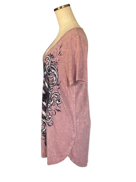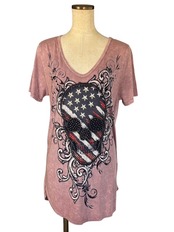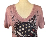 ・柔らかなタイダイプリント桃色に、激しいアメリカ国旗のスカルが印象的。
