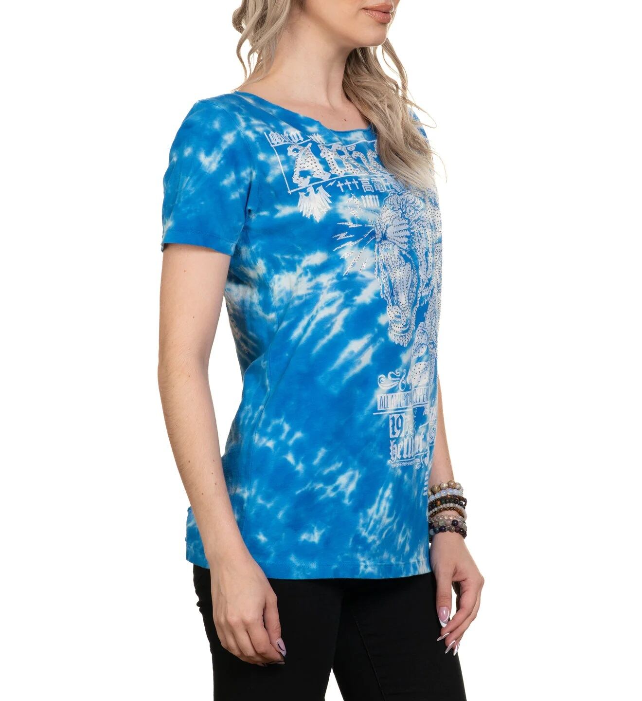 ・タイダイプリントのターコイズブルー地に、ラインストーンをふんだんに使ったデザイン。